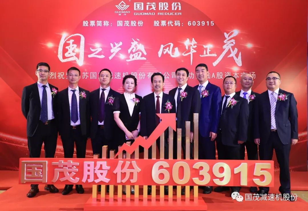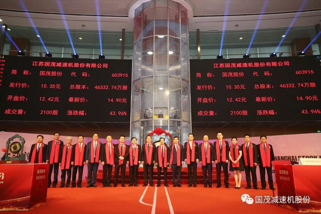 2019年6月14日上午9點30分,江蘇國茂減速機(jī)股份有限公司上市儀式于上海證券交易所舉行,宣告江蘇國茂減速機(jī)股份有限公司正式上市,股票簡稱為“國茂股份”,股票代碼為“603915”。這是國茂股份一個值得記載的歷史時刻,這也是一個新起點,國茂股份風(fēng)帆高揚(yáng)、破冰踏浪,開啟登陸資本市場的新征程!